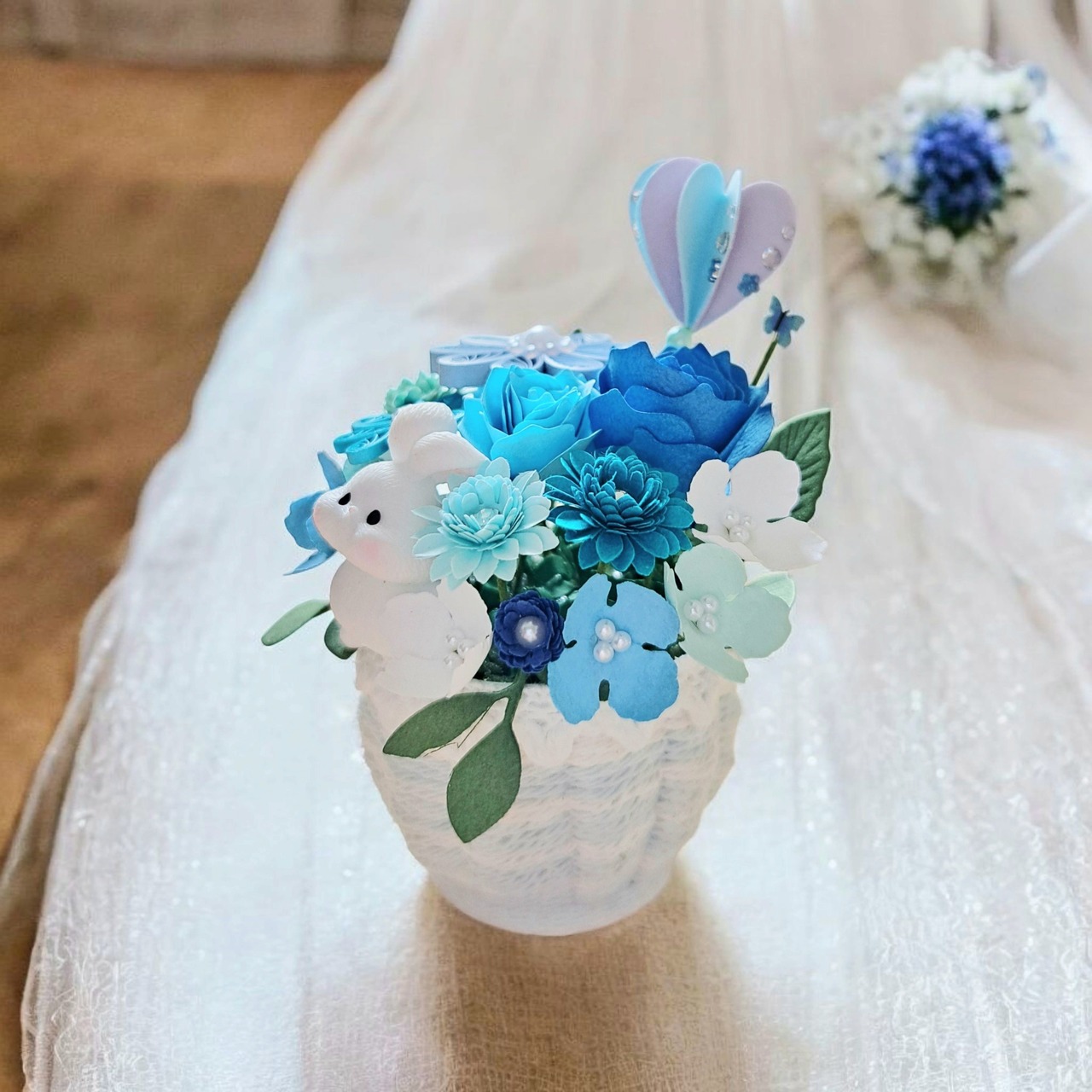 ぷっくりほっぺたのうさぎちゃんと、きれいな青い紙のお花が、あなたの空間を愛らしく彩ります♡