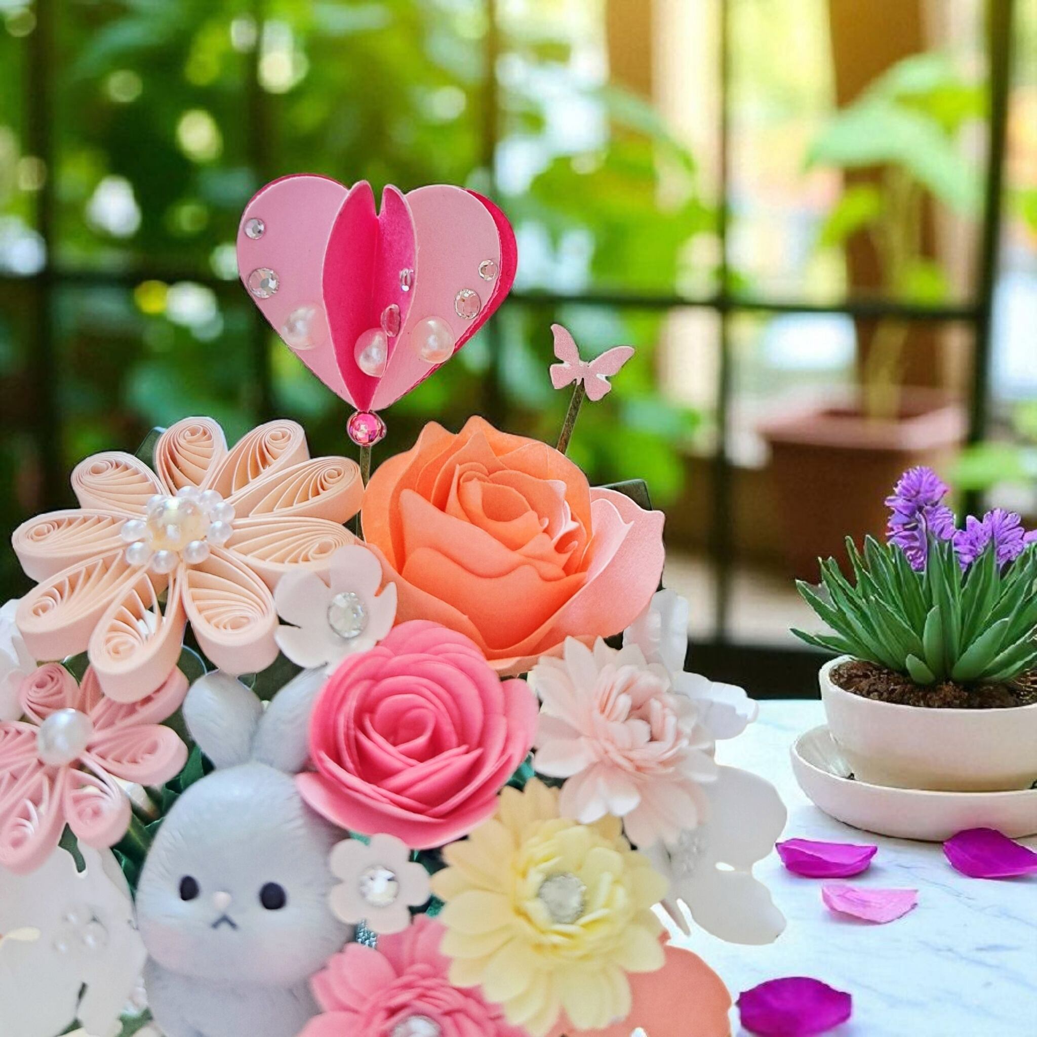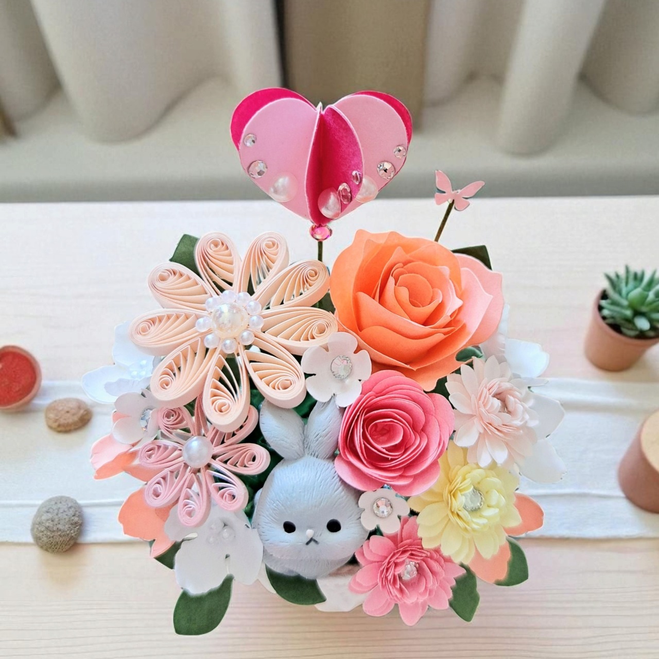 ちょこんとうさぎちゃんが覗いてる♡ ピンクの可愛いフラワーアレンジ! ペーパークラフト ペーパークイリング
