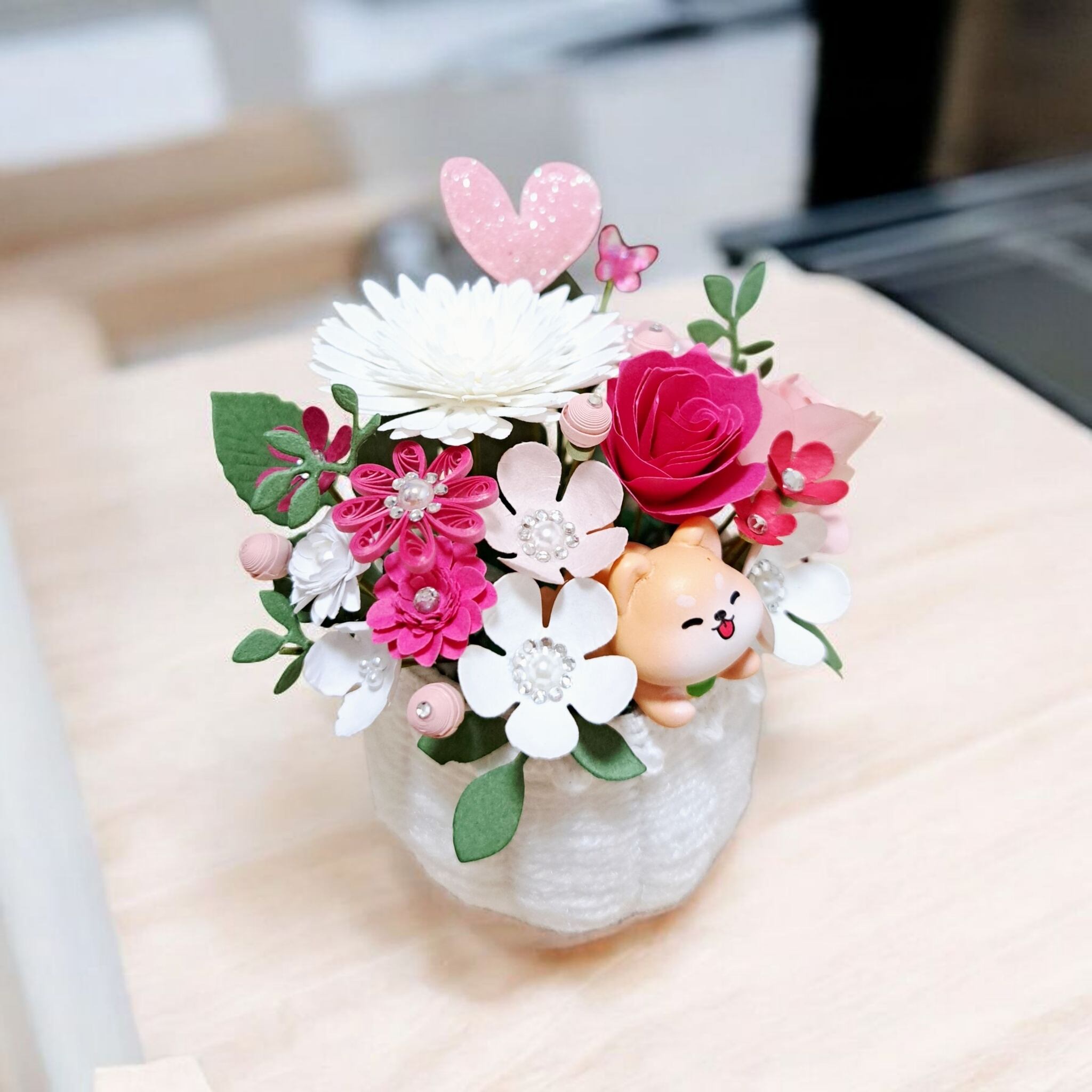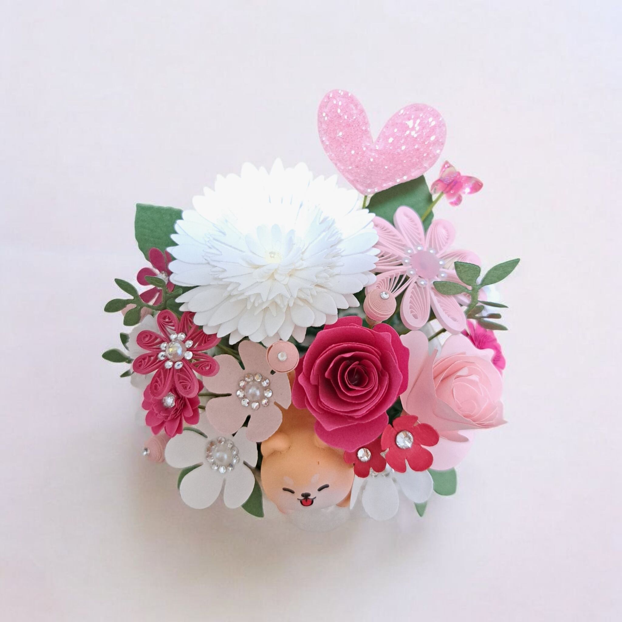 可愛いわんこと枯れないお花♡ ペーパークイリングのフラワーアレンジです!