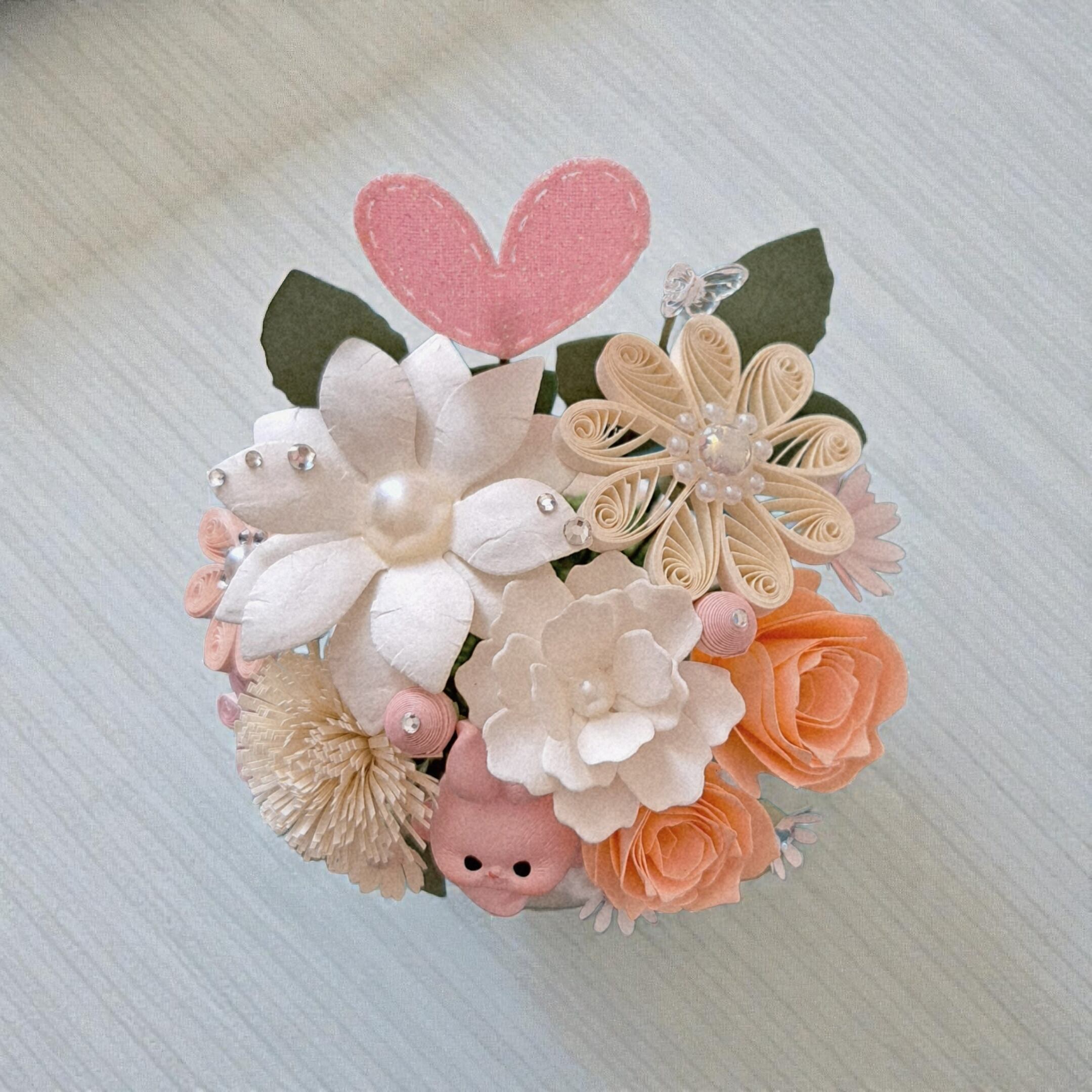 このアレンジメントは、愛らしいぷっくりうさぎと、繊細なペーパーフラワーが組み合わさっています。見る人の心をほっこりと温める魅力があります♡