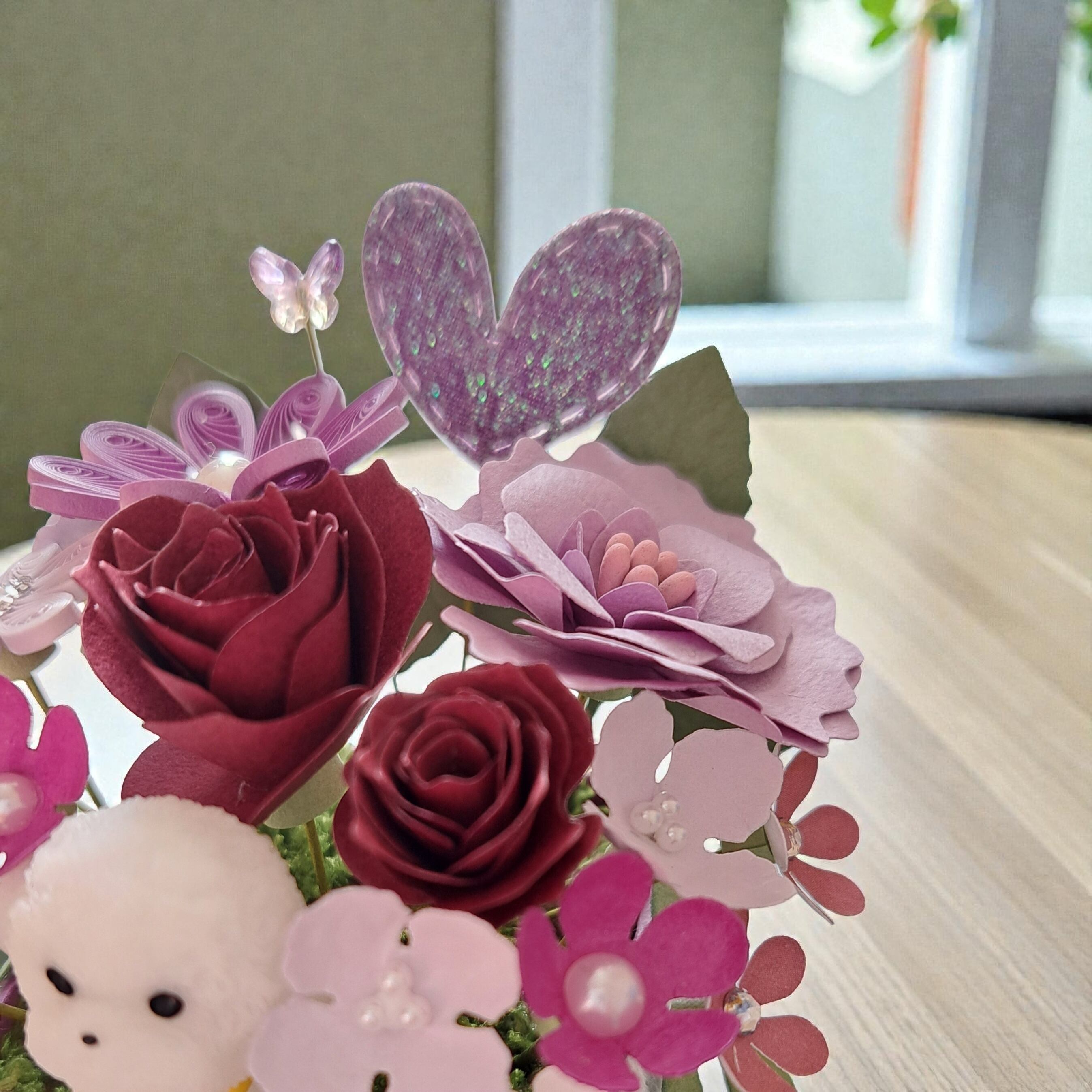 このアレンジメントは、愛らしいわんこと、鮮やかなパープル系のペーパーフラワー、そしてキラキラのハートや蝶々が組み合わさって、見る人の心をほっこりとさせる魅力を持っています♡